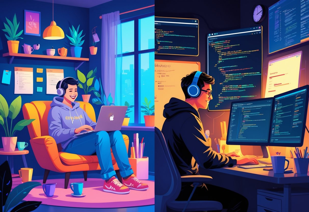 Two individuals coding side by side; one relaxed with casual surroundings and colorful shapes, the other focused at a desk with multiple monitors showing complex codeVibe coding uses AI tools to generate code from plain language instructions instead of requiring you to manually write every line. The approach relies on natural language prompts and AI-powered tools that interpret your requests and produce working code in real time.
